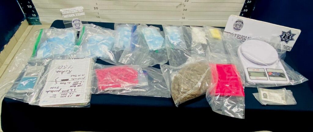 Playa del Carmen.- El resultado de los operativos permanentes de vigilancia de la Policía Municipal de Solidaridad durante la noche y la madrugada, logró el aseguramiento de un arma de fuego, más de 500 posibles dosis de marihuana, cocaína, cristal y piedra, y se detuvo a seis personas posiblemente relacionadas con la venta de narcóticos.