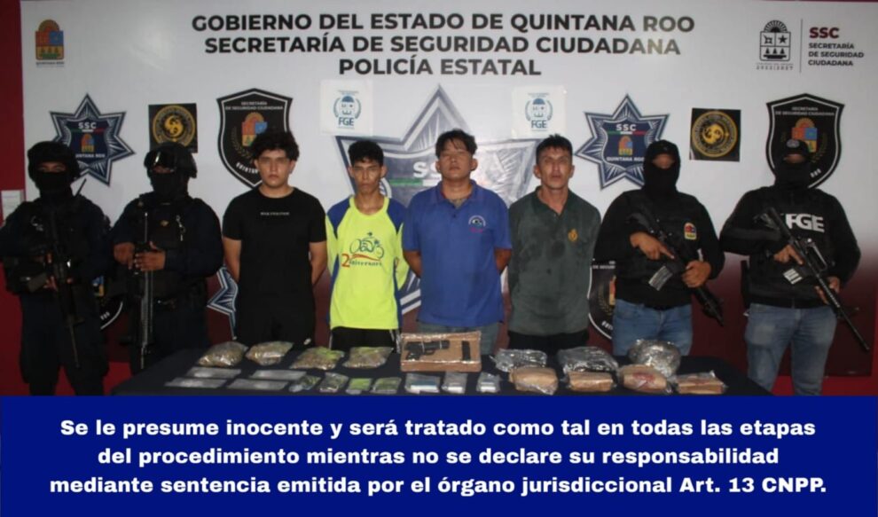 CancĂșn.- En posesiĂłn de mĂĄs de 100 dosis de estupefacientes, un arma de fuego y otros artĂculos fueron detenidos cuatro hombres en la supermanzana 226, quienes presuntamente usaban un mototaxi para distribuir su “producto”.