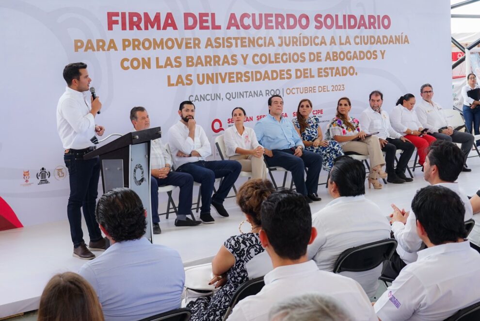 Cancún.- El Secretario de Bienestar, Pablo Bustamante Beltrán, acompañó a la Gobernadora Mara Lezama a la primera edición de las Caravanas de Justicia para el Bienestar, donde se llevó a cabo la firma de acuerdo solidario del Gobierno de Quintana Roo con barras y colegios de abogados del Estado, así como con universidades para promover la asistencia jurídica gratuita a la ciudadanía.