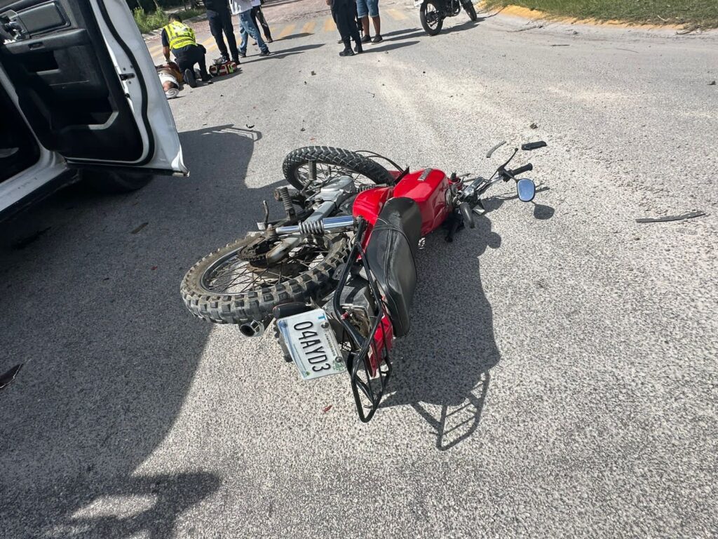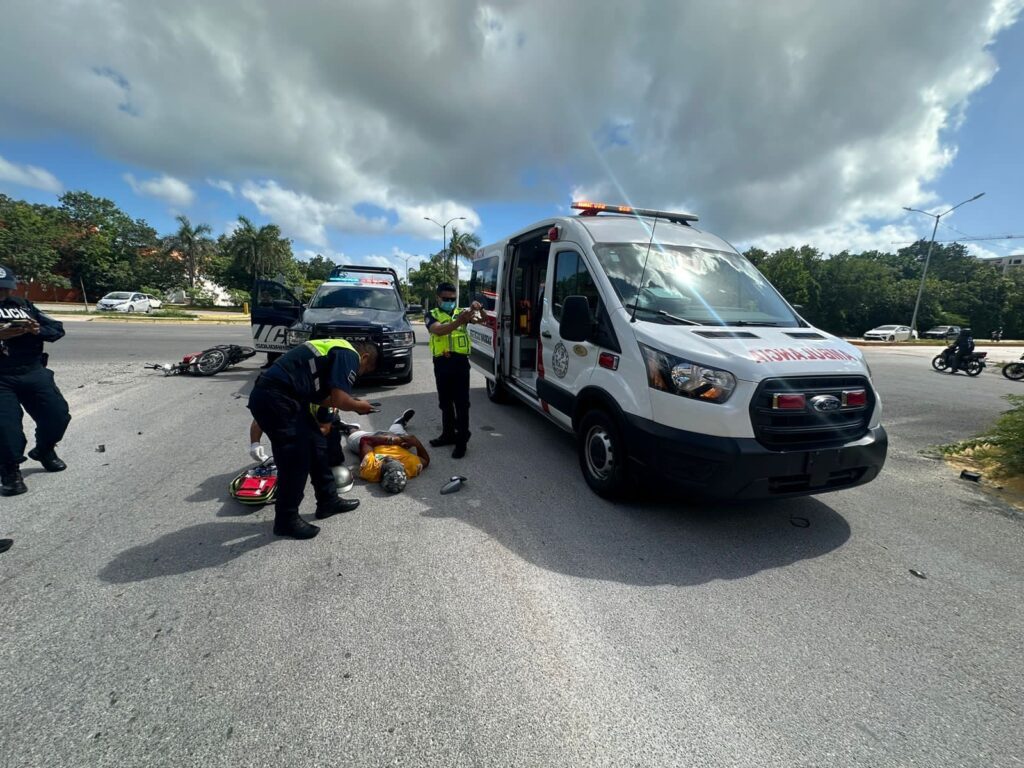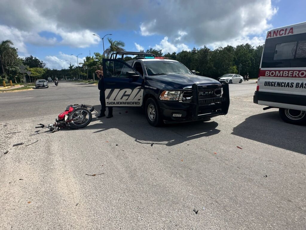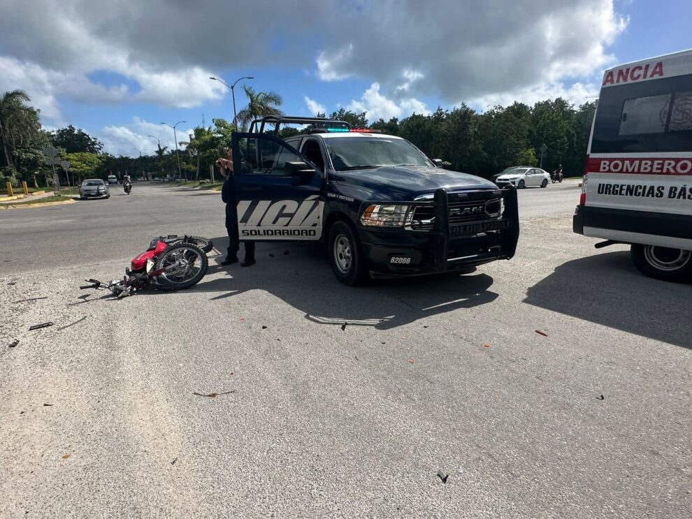 Playa del Carmen.- Con una lesión grave en un brazo terminó un motociclista que circulaba en la colonia Cruz de Servicios, cuando fue impactado por el chofer de un vehículo que no respetó su alto y posteriormente de haber ocasionado el accidente se dio a la fuga.