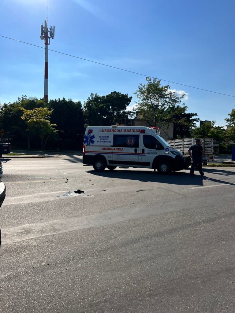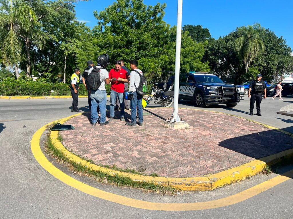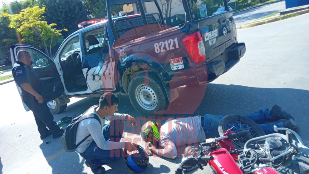 Playa del Carmen.- Al salir sin precaución de la entrada del fraccionamiento la Toscana un elemento de la Policía Municipal provocó que un motociclista se impactara en un costado de su patrulla, por lo que el joven fue trasladado al hospital por paramédicos.