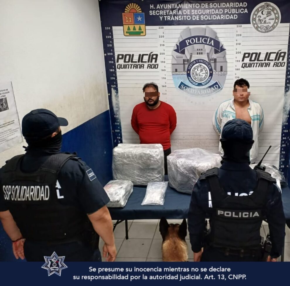 Playa del Carmen.- La Policía Municipal de Solidaridad da golpe al narcomenudeo con la detención de 2 personas y el aseguramiento de 36 paquetes grandes con posibles narcóticos, como parte del trabajo de prevención para hacer frente a este delito y mantener la paz en el municipio.