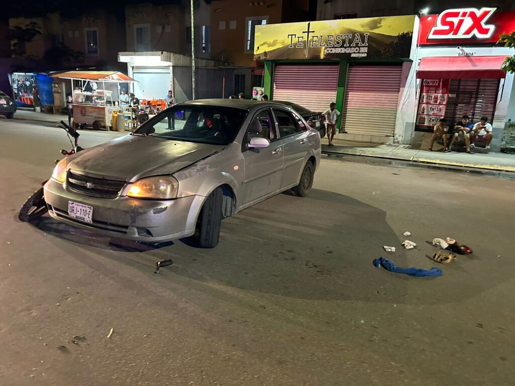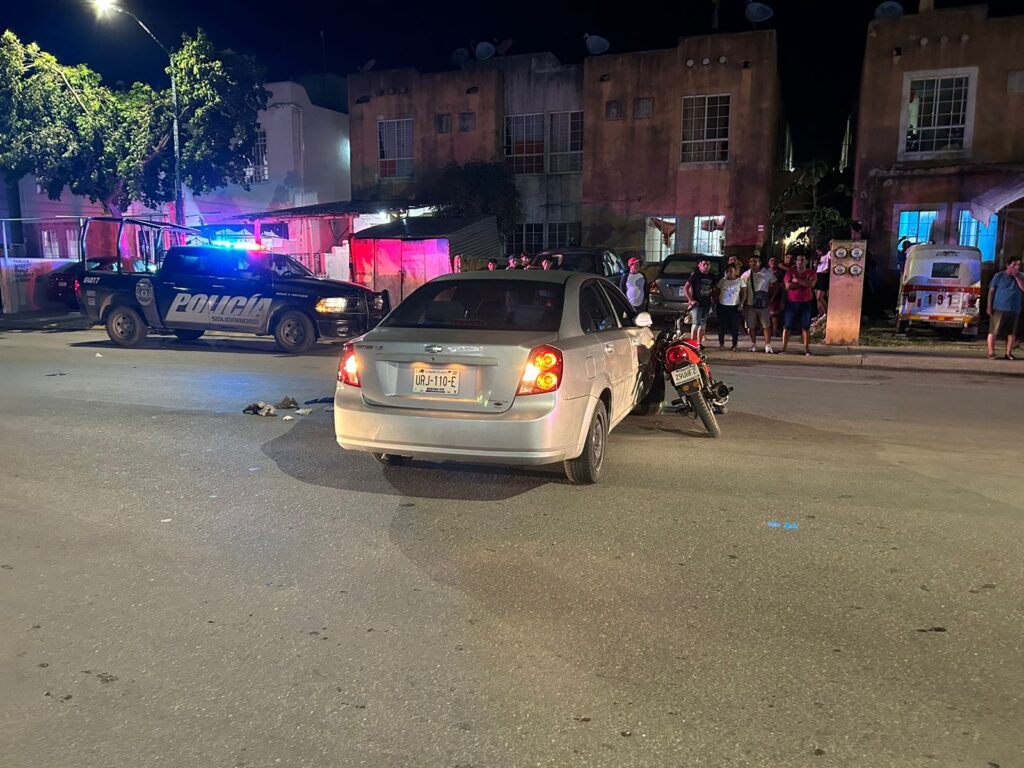 Playa del Carmen.- Mujer es trasladada a un hospital luego de que al circular a bordo de una motocicleta junto con su marido, un vehículo se les atravesó cuando el chofer quiso dar vuelta en ‘U’ sin precaución, en el fraccionamiento Villas del Sol.