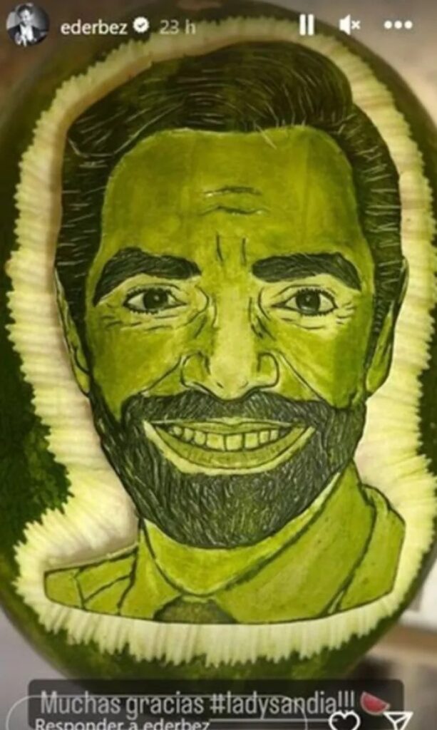 “Chequen esto, ahí está tallada mi cara en una sandía, pero vean el trabajo, el detalle, es una obra de arte; o sea, sí la talló en una sandia”, dijo en un video que publicó en sus historias de Instagram.