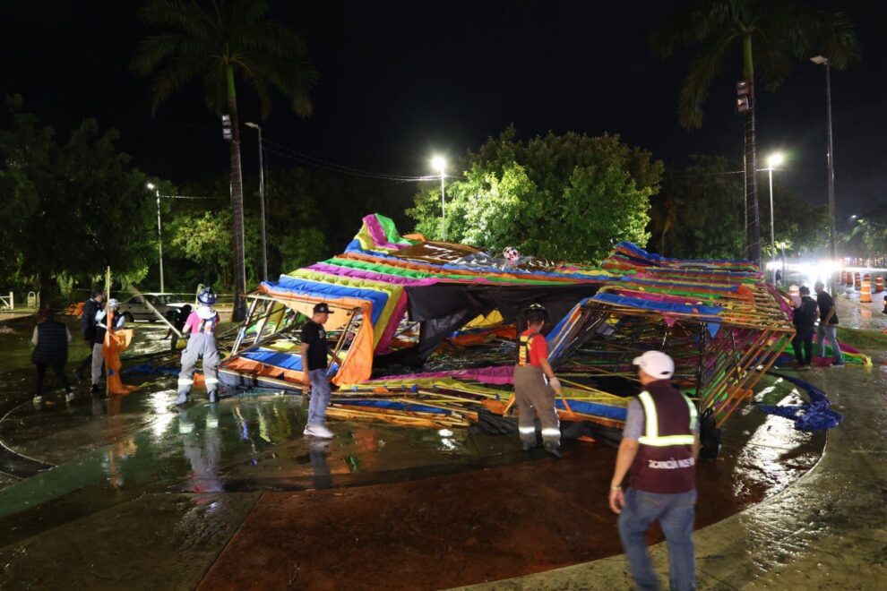 Cancún.- Con motivo de las condiciones climatológicas, las actividades navideñas en el Malecón Tajamar se suspendieron la noche de este domingo para resguardo a la integridad física de la ciudadanía; sin embargo, la estructura del tradicional “Burrito Sabanero” instalado en la entrada del lugar, no soportó las lluvias fuertes acompañadas de vientos de hasta 70km/h, provocando su caída, sin que se registraran lesionados, por lo que Ayuntamiento de Benito Juárez, procedió al desmantelamiento total de sus partes.
