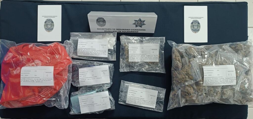 Playa del Carmen..- La Policía Municipal de Solidaridad aseguró a dos sujetos y más de 70 envoltorios con posibles drogas como metanfetamina, cocaína y marihuana sobre la carretera federal en el tramo de Puerto Aventuras – Playa del Carmen.