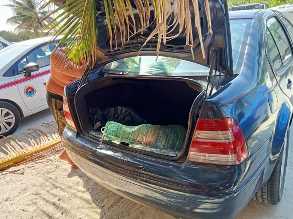 En coordinación con la Dirección de Seguridad Pública y Tránsito Municipal de Cozumel, personal naval localizó un vehículo con las características descritas en el reporte. Tras una inspección, se encontró una bolsa de tela mosquitera en la cajuela, conteniendo aproximadamente 37.28 kilogramos de pulpa de caracol blanco fresco, cuya procedencia no pudo ser verificada.