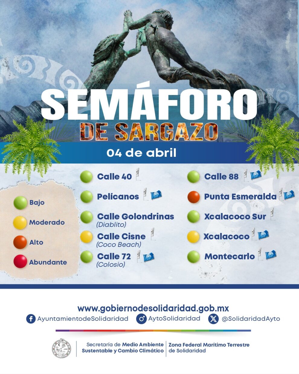 Playa del Carmen.- El semáforo de sargazo en verde indica condiciones favorables en las playas: fundadores, de la calle 2 a la 16, Constituyentes, Mamitas, Pelicanos, Xcalacoco, calle 38, 40 y 72 por mencionar algunas, lo que se traduce en una experiencia más placentera para los visitantes.