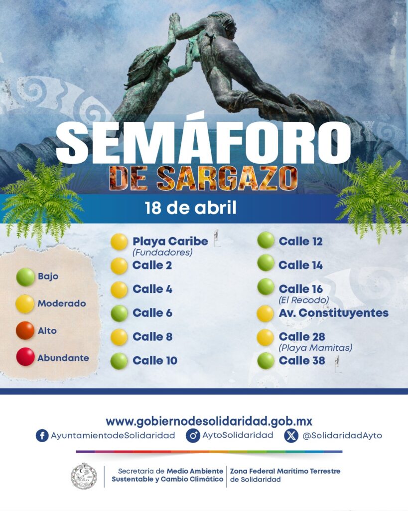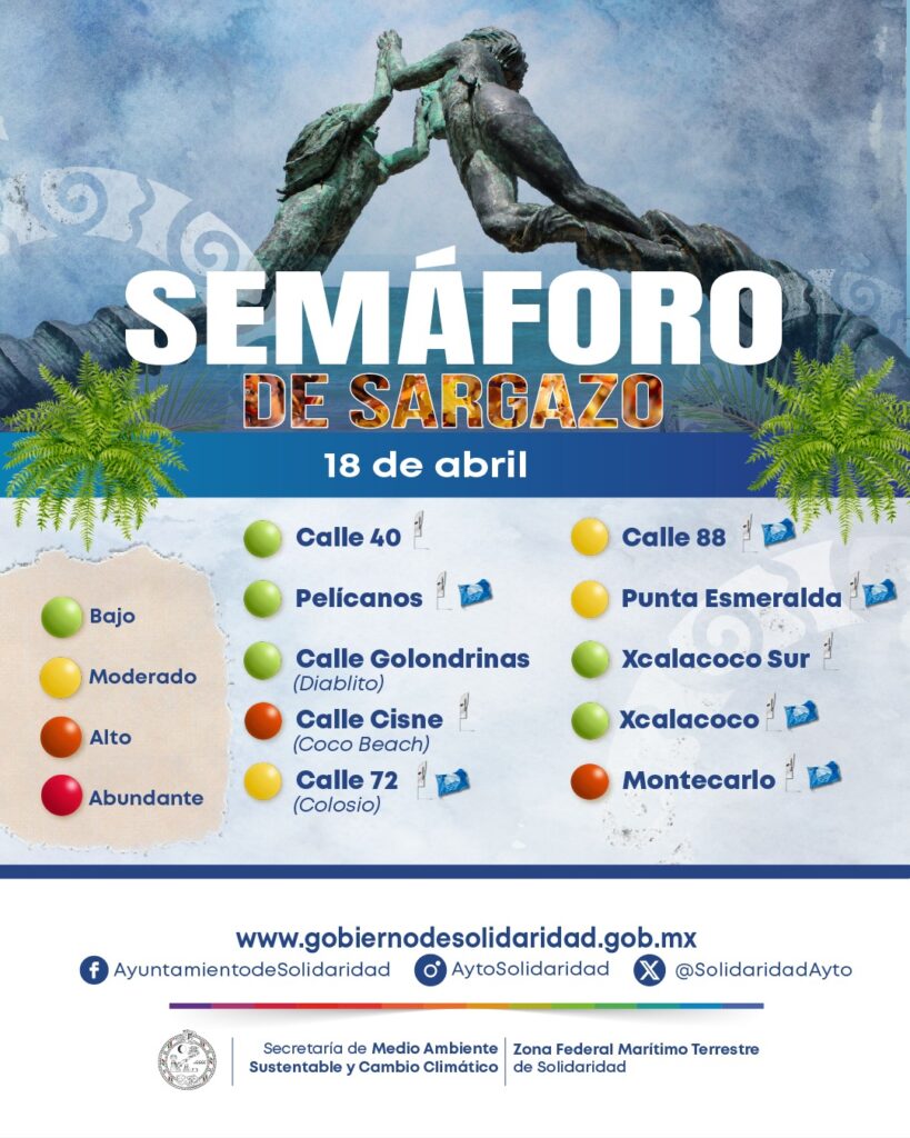 Playa del Carmen, Solidaridad a 18 de abril del 2024.- A través del semáforo de sargazo se mantiene informada a la ciudadanía. Conoce las playas que puedes visitar. El día de hoy indica verde con condiciones favorables en las playas: de la calle 2, 4, 6, 10, 12, 14, 16, 38, Xcalacoco y Golondrinas.
