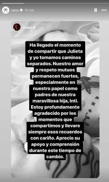 “Ha llegado llegado el momento de compartir que Julieta y yo tomamos caminos separados. Nuestro amor y respeto mutuos permanecen fuertes, especialmente en nuestro papel como padres de nuestra maravillosa hija Inti”, se lee en la primera parte del mensaje.