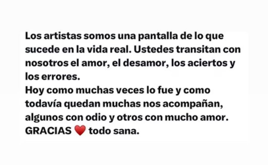 “Los artistas somos una pantalla de lo que sucede en la vida real. Ustedes transitan con nosotros el amor, el desamor, los aciertos y los errores. Hoy como muchas veces lo fue y como todavía quedan muchas nos acompañan, algunos con odio y otros con mucho amor. Gracias. Todo sana”.