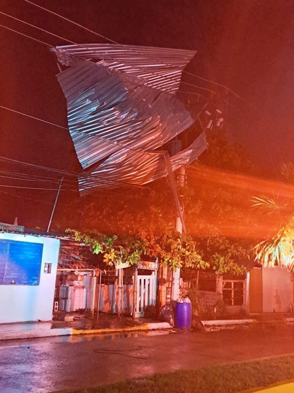 En la avenida 85 diagonal con calle 14, el techo de una vivienda se desprendió por el aire y quedó atorado en un poste, causando el corte del suministro de energía eléctrica, por lo que elementos de Protección Civil y Comisión Federal de Electricidad (CFE) tuvieron que intervenir para quitarlo.