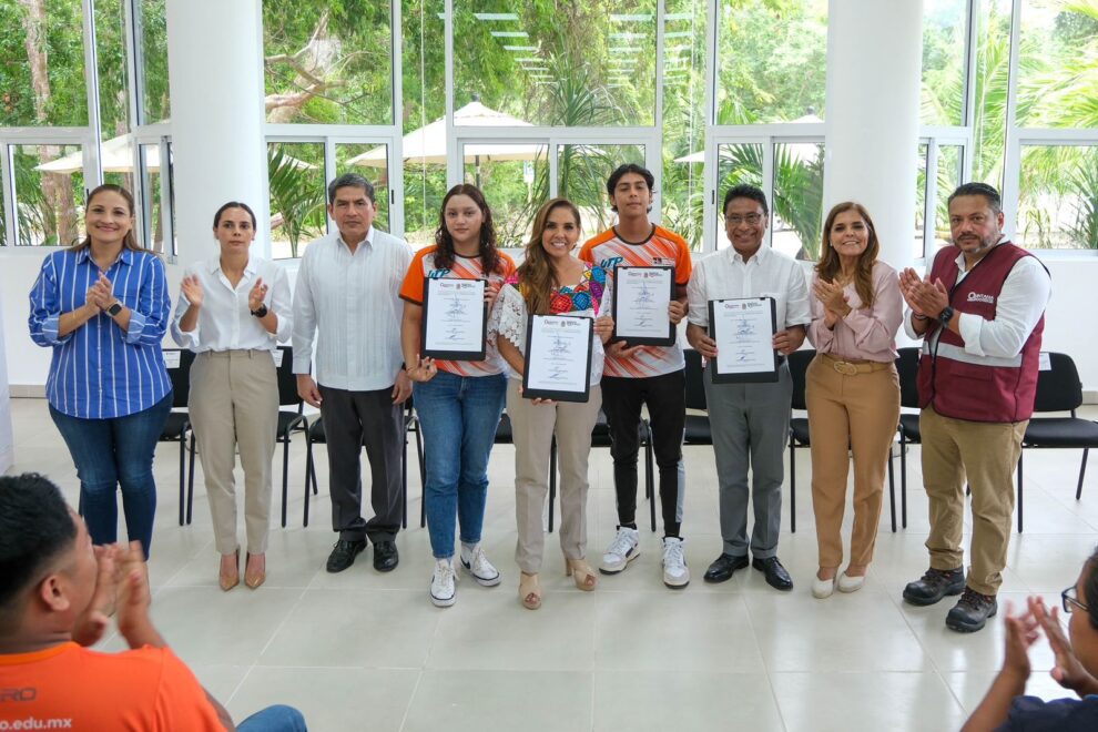 Estuvieron en el presídium la presidenta honoraria del Sistema DIF Quintana Roo, Verónica Lezama Espinosa; los alumnos María Fernanda Cruz Sangerman y Mauricio Alberto Velasco Molina; la presidenta municipal de Benito Juárez, Ana Paty Peralta de la Peña; el Rector Manuel Alfredo Pech Palacio; la Comisionada Presidenta del IDAIPQROO, Magda Eugenia de Jesús Lozano Ocman; el secretario de Educación Carlos Manuel Gorocica Moreno; y el director general del Instituto de Infraestructura Física Educativa del Estado de Quintana Roo, José Rafael Lara Díaz.