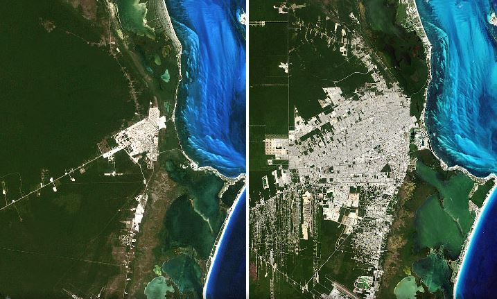 🔺La NASA revela cómo era antes y después la zona turística de Cancún, con sorprendentes fotos satelitales, las imágenes dejan ver el crecimiento exponencial de la zona turística.