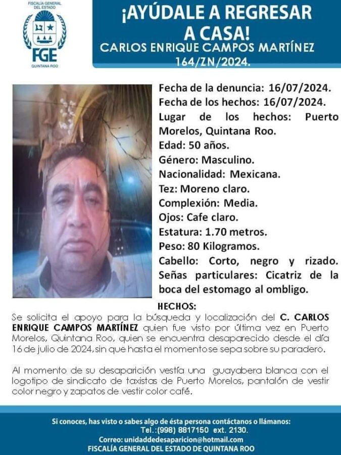 Según la información proporcionada por la Fiscalía General del Estado en la alerta de búsqueda, Carlos Enrique mide 1.70 metros, tiene cabello negro corto y rizado y el día de su desaparición, vestía una camisa blanca con el logotipo del sindicato de taxistas de Puerto Morelos.