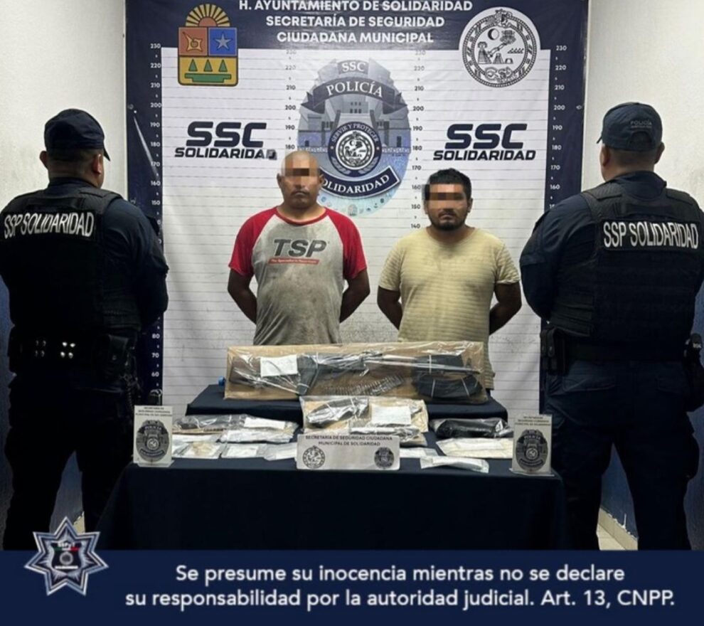 La Secretaría de Seguridad Ciudadana Municipal de Solidaridad aseguró a dos hombres por presuntos delitos contra la salud y **vi0l∆ci0n** a la Ley Federal de Armas de Fuego y Explosivos, en la colonia Luis Donaldo Colosio.