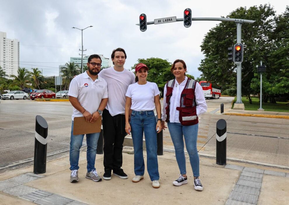Durante la actividad, constató las adecuaciones realizadas en las intersecciones de las avenidas Tulum con Sayil, Tulum con Nichupté y Bonampak con Nichupté, las cuales fueron rehabilitadas para contar con líneas peatonales, líneas podotáctiles, bolardos, así como botones de emergencia; garantizando la accesibilidad universal y seguridad de peatones.