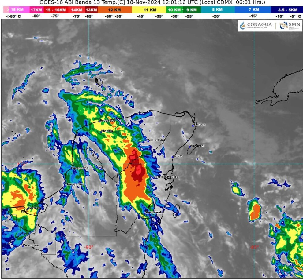 Por otro lado, un canal de baja presión sobre el suroeste del golfo de México y el sureste de la República Mexicana, en interacción con la baja presión remanente de Sara, originarán lluvias puntuales intensas en Chiapas; y puntuales fuertes en Oaxaca, Campeche Yucatán y Quintana Roo.