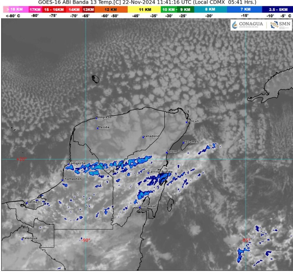 En la Península de Yucatán, por la mañana, el cielo estará nublado y el ambiente fresco en la región, siendo templado en zonas de costa. Durante la tarde ambiente cálido, cielo medio nublado con lluvias aisladas en zonas de Campeche, y sin lluvia en Yucatán y Quintana Roo. Viento de componente norte de 20 a 30 km/h en la región, con rachas de 40 a 60 km/h en costas de Campeche, Yucatán y Quintana Roo.