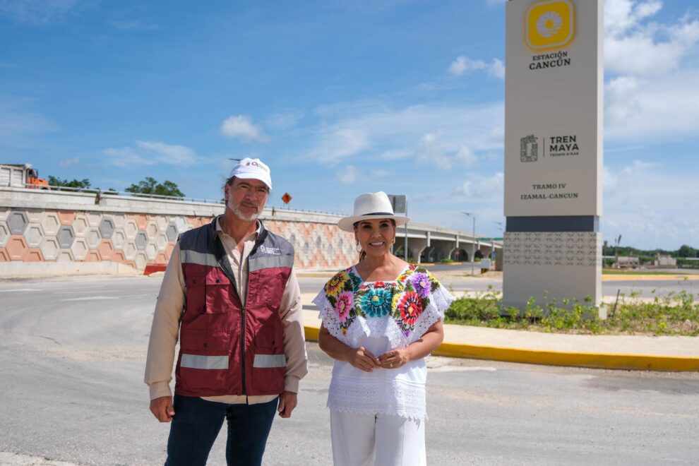 Cancún.- La Gobernadora Mara Lezama Espinosa informó que la construcción del entronque de la estación Cancún del Tren Maya con la carretera federal 180-D tiene un avance del 92%; restan detalles de jardinería, iluminación, señalamientos y guarniciones.