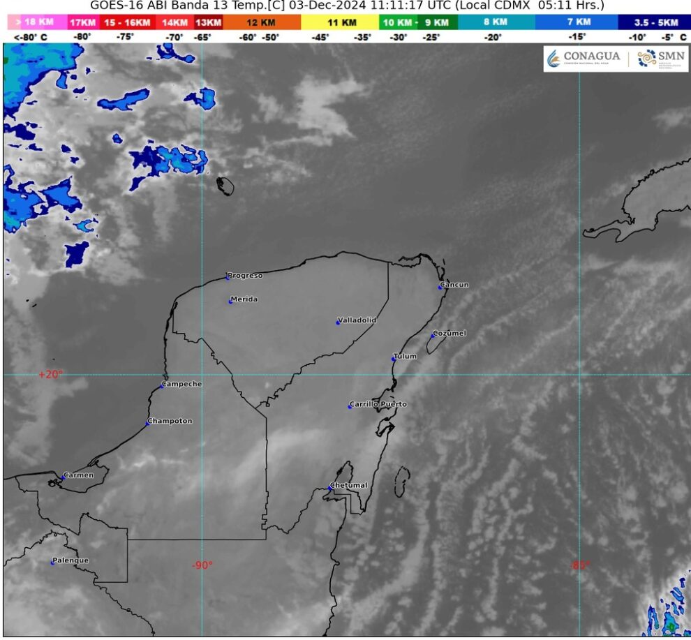 En la Península de Yucatán, el cielo estará medio nublado durante el día y sin lluvia. Por la mañana, ambiente templado y cálido por la tarde, con viento del este y noreste de 30 a 40 kilómetros por hora con rachas de 50 a 70 km/h en la región, así como oleaje de 2 a 3 metros de altura en zonas costeras.