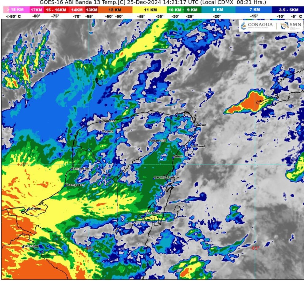 El ingreso de humedad procedente del océano Pacífico, golfo de México y mar Caribe, en combinación con inestabilidad en niveles altos de la atmósfera, propiciará lluvias y chubascos en el centro, oriente, sur y sureste mexicano, además de lluvias fuertes a puntuales muy fuertes en la península de Yucatán