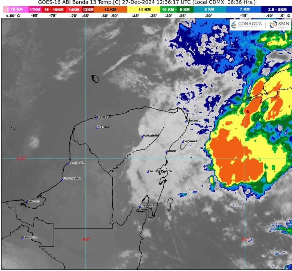 En la Península de Yucatán, el cielo estará nublado la mayor parte del día, con probabilidad de lluvias e intervalos de chubascos, acompañados con descargas eléctricas en la región. El ambiente será templado a fresco en zonas de Campeche y Yucatán; por la tarde, cálido a caluroso, con viento de dirección variable de 20 a 30 kilómetros por hora y rachas de 40 a 60 en Campeche y Yucatán.