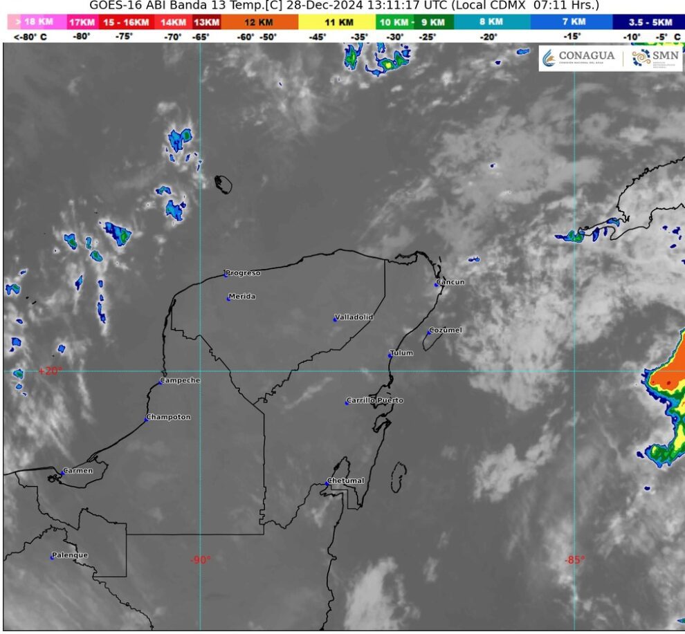 Península de Yucatán: Cielo medio nublado a nublado la mayor parte del día. Por la mañana, bancos de niebla en el sur y oriente de Campeche, así como en gran parte de Yucatán y Quintana Roo. Ambiente templado, siendo fresco en zonas de Campeche. Probabilidad de lluvias aisladas matutinas. Durante la tarde, ambiente cálido (con temperaturas de 30 a 35 °C en zonas de Campeche, Yucatán y Quintana Roo).