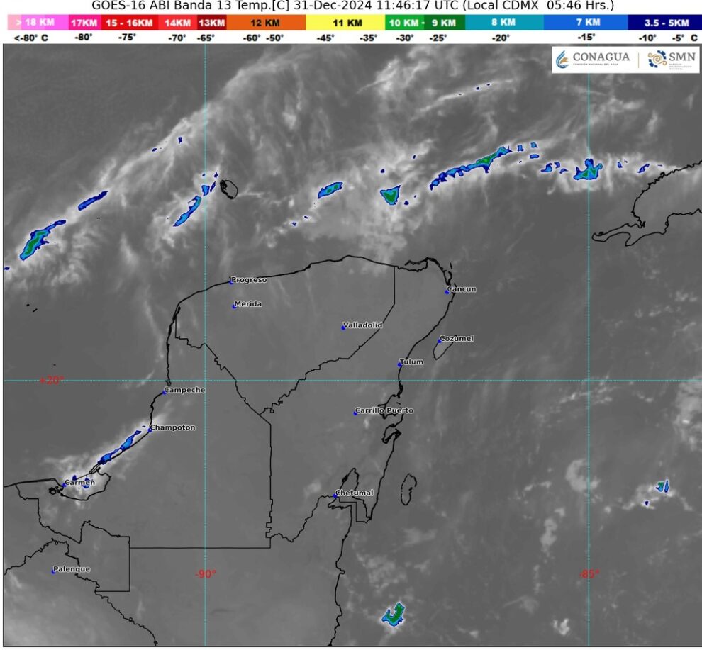 En la Península de Yucatán, el cielo estará medio nublado a nublado la mayor parte del día. Por la mañana, habrá bancos de niebla en zonas de la región y ambiente fresco a templado. Durante la tarde, ambiente caluroso, y probabilidad de intervalos de chubascos en Campeche, Yucatán y Quintana Roo, mismos que se podrían acompañar con posibles descargas eléctricas. Viento del este y noreste de 15 a 30 km/h en la región, con rachas de 40 a 50 km/h en Campeche y Yucatán.