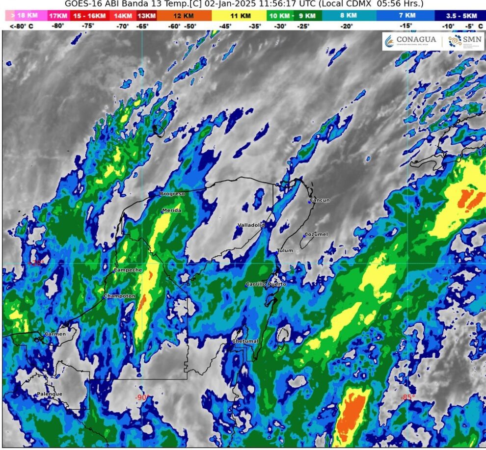 En la Península de Yucatán, el cielo estará nublado la mayor parte del día, durante la mañana, se esperan bancos de niebla, ambiente fresco y templado en zonas costeras y en la tarde, ambiente cálido y lluvias puntuales fuertes con posibles descargas eléctricas en Campeche, Yucatán y Quintana Roo, las cuales podrían ocasionar encharcamientos e inundaciones. Viento del este y noreste de 20 a 30 km/h en la región, con rachas de 30 a 50 km/h en zonas de Campeche, Yucatán y Quintana Roo; además de oleaje de 1 a 2 metros de altura en las costas de Quintana Roo.