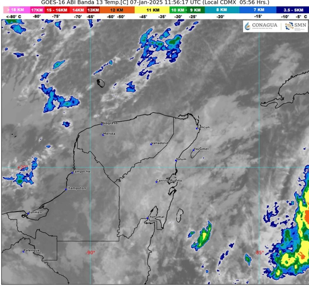 En la Península de Yucatán, durante el trascurso del día, habrá cielo medio nublado a nublado. Por la mañana, bancos de niebla y ambiente fresco, siendo templado en costas. Durante la tarde, ambiente templado a cálido; lluvias puntuales fuertes con descargas eléctricas en Campeche y Quintana Roo. Evento de “Norte” de 10 a 20 km/h en la región, con rachas de 30 a 50 km/h en costas de la península.