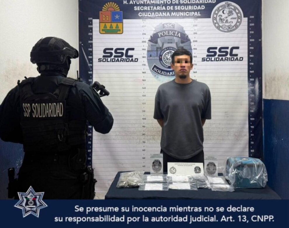 La Secretaría de Seguridad Ciudadana Municipal (SSCM) de Solidaridad detuvo a una persona del sexo masculino con 37 posibles dosis de narcóticos en el fraccionamiento Selvanova.