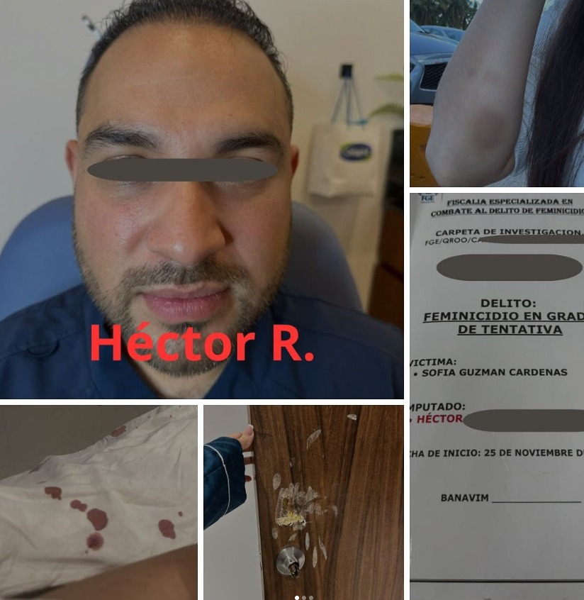 Una joven influencer y empresaria de Cancún denunció haber sido víctima de un intento de feminicidio por parte de su expareja, Héctor “N”, un reconocido anestesiólogo de la ciudad. Según su testimonio, el ataque ocurrió el pasado 25 de noviembre, cuando él la golpeó brutalmente con un martillo, la arrastró por la habitación y la asfixió con sus rodillas.
