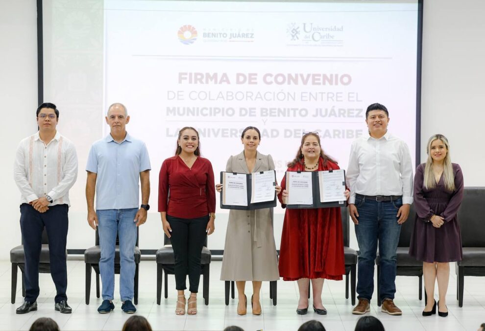 Cancún.- Al encabezar la firma de convenio de colaboración entre el municipio de Benito Juárez y la Universidad del Caribe (Unicaribe), la Presidenta Municipal Ana Paty Peralta subrayó que este tipo de alianzas suman talentos de las nuevas generaciones para la construcción del futuro de Cancún desde las aulas, la investigación y con mucho compromiso por la ciudad.