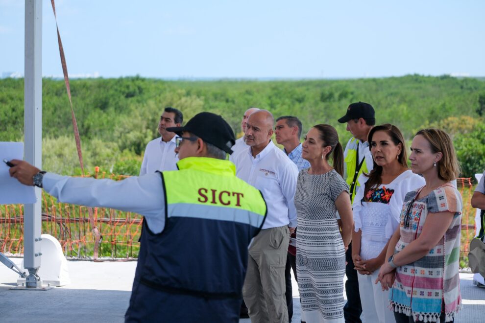 La Presidenta Claudia Sheinbaum, durante el recorrido de supervisión, explicó que se utiliza un sistema constructivo que protege el mangle, pues se avanza desde arriba en vez de hacerlo por abajo. Esto protege también el medio ambiente.