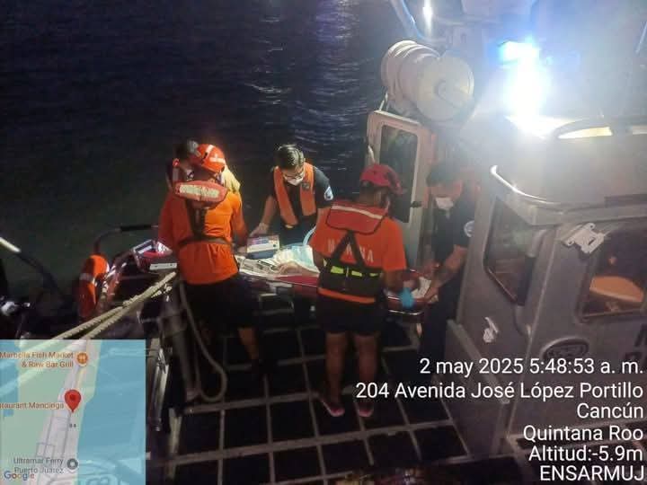 Tras revisar a la paciente en alta mar, se procedió a su traslado hasta Puerto Juárez, donde una ambulancia particular la esperaba para llevarla a un hospital y recibir atención médica especializada.