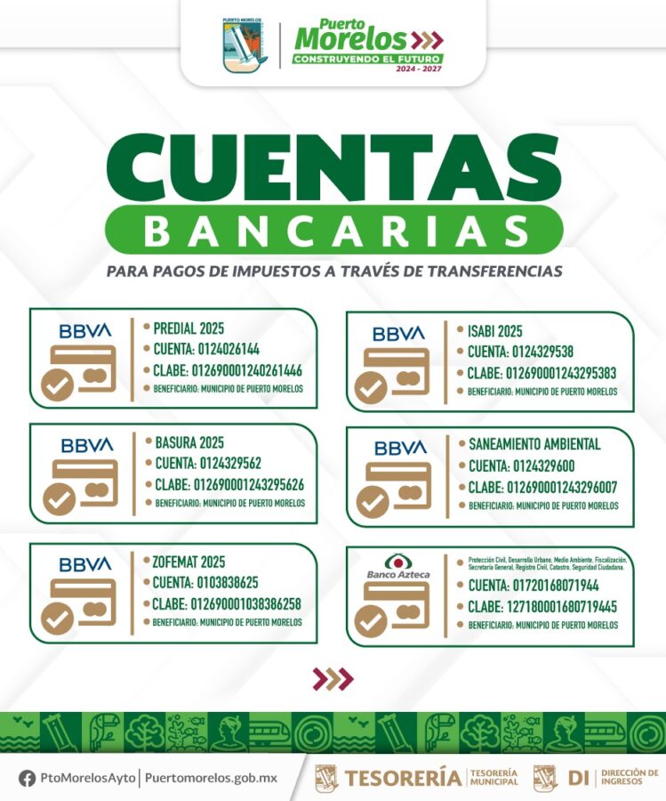 Para el ISABI (Impuesto de Adquisición de Bienes Inmuebles) BBVA 0124329538 – Clabe 012690001243295383; Saneamiento Ambiental BBVA 0124329600 – Clabe 012690001243296007; para las áreas de Protección Civil, Desarrollo Urbano, Medio Ambiente, Fiscalización, Secretaría General, Registro Civil, Catastro y Seguridad Ciudadana en Banco Azteca 01720168071944 – Clabe 127180001680719445.