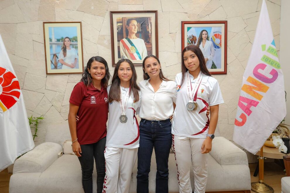 CancĂșn.- La Presidenta Municipal, Ana Paty Peralta, recibiĂł en su despacho a las atletas representantes del municipio de Benito JuĂĄrez, Victoria Alejandra MarĂn Flores y Victoria Gameba GarcĂa GĂŒemez, ganadoras de medallas en la Olimpiada Nacional CONADE 2025, realizada el pasado junio en Guadalajara, Jalisco, asĂ como a su entrenadora Lesly Yamily GĂłmez Caballero.