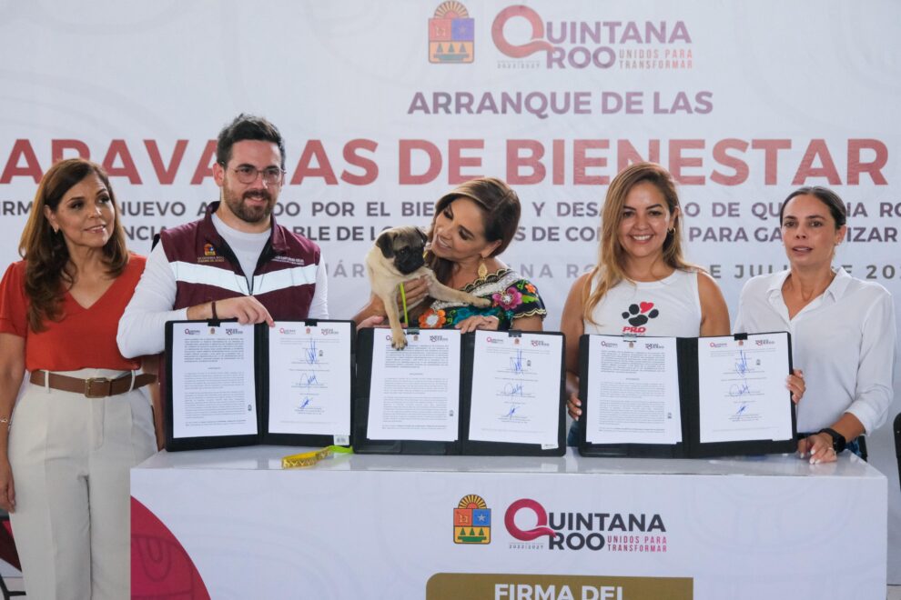 Durante el evento, la gobernadora Mara Lezama firmó el Nuevo Acuerdo por el Bienestar y Desarrollo de Quintana Roo para Promover la Tenencia Responsable de los Animales de Compañía para Garantizar su Bienestar, flanqueada por la perrita Nena y Papi, un perrito de raza Pug. Asimismo, firmaron el secretario de Ecología y Medio Ambiente, Óscar Rébora Aguilera, y la sociedad civil, “Dejando Huella Na’ Lu’ Um”, representada por su presidenta, Mónica Chavarría Soriano.