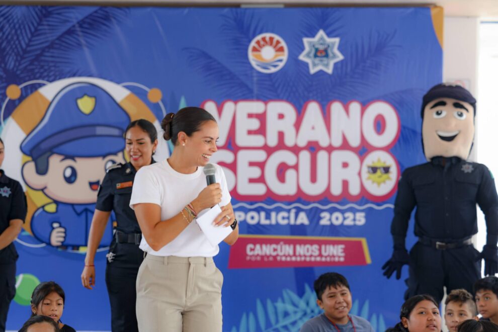 Cancún.- A fin de seguir fomentando la convivencia y el desarrollo de habilidades sociales, deportivas y recreativas de los niños cancunenses, la Presidenta Municipal, Ana Paty Peralta, visitó el curso “Verano Seguro, Policía 2025”, en el que están inscritos 45 pequeños y adolescentes entre los 9 y 13 años de edad, para aprender sobre temas preventivos y educativos hasta el próximo 15 de agosto.