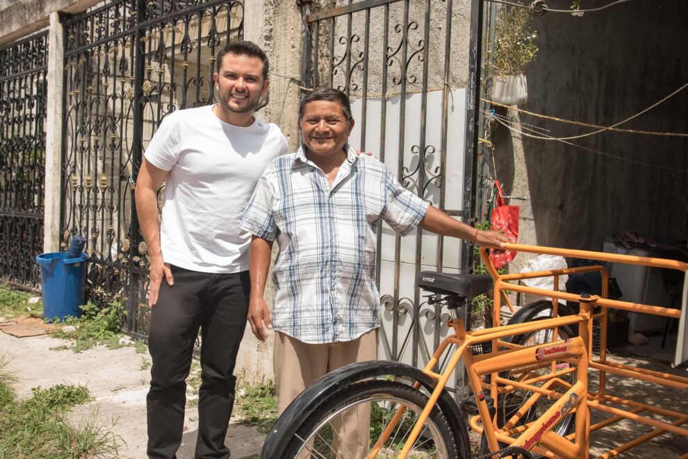 Don Jesús Jun, quien recolecta latas y plásticos para sostener a su familia, recibió del Secretario un triciclo con el que podrá realizar sus recorridos de manera más rápida y segura.