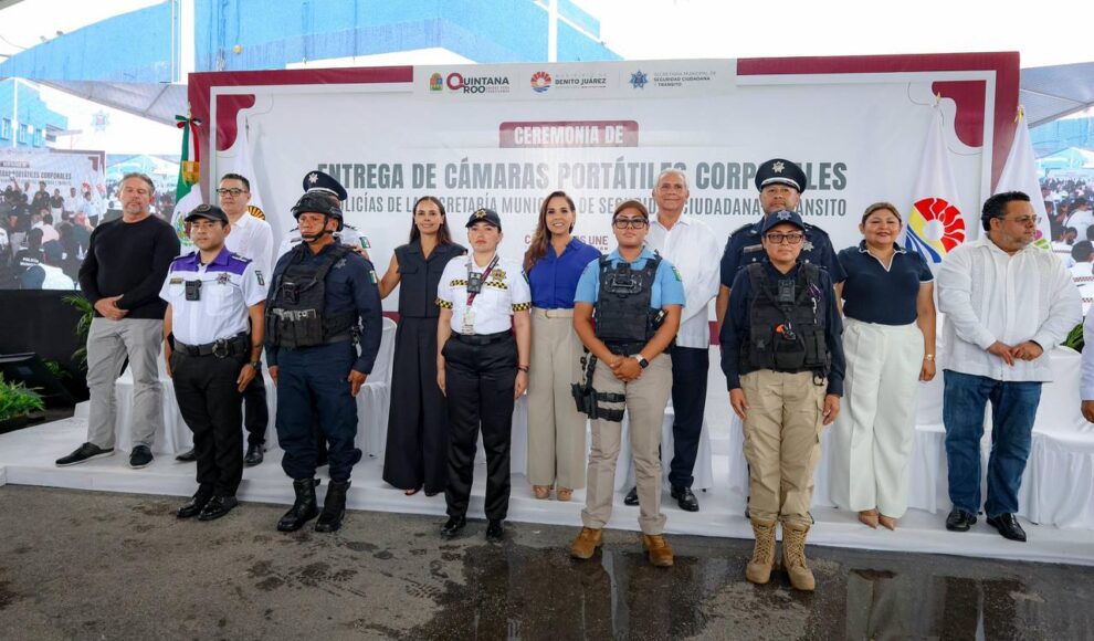 Cancún.- “Hoy damos un paso muy importante: a partir de este día, entran en operación 725 cámaras corporales, que portarán todas y todos los policías en labores de calle: Seguridad Ciudadana, Tránsito, GEAVIG, Policía Auxiliar, Policía Turística y el Grupo de Búsqueda y Localización”, subrayó la Presidenta Municipal, Ana Paty Peralta, al encabezar con la gobernadora Mara Lezama, la entrega de dichos dispositivos para los elementos de corporación.
