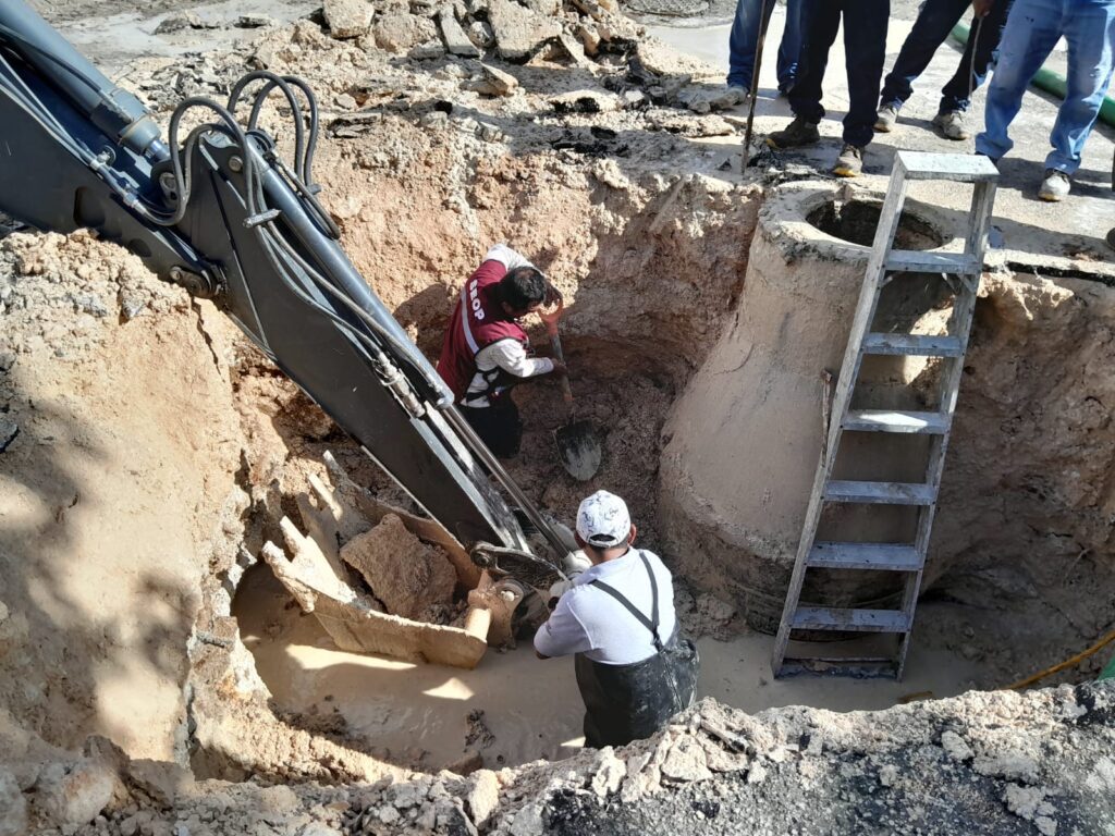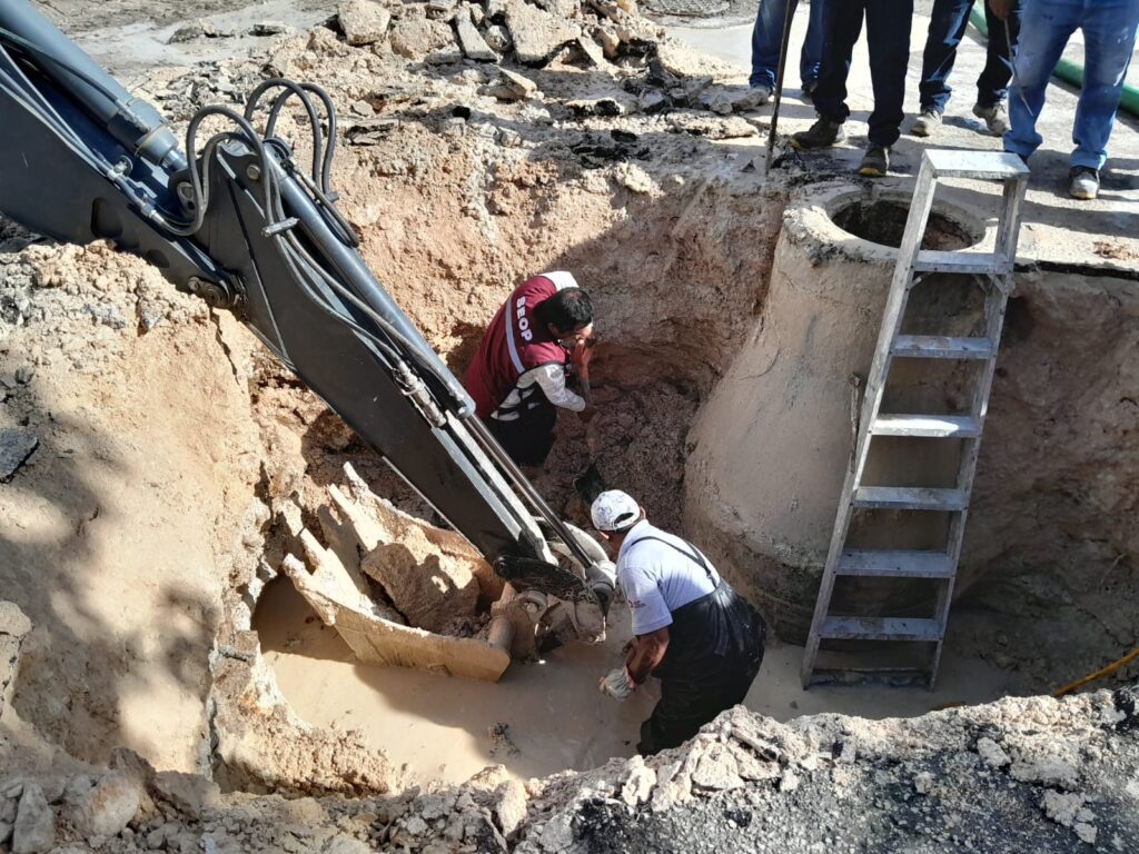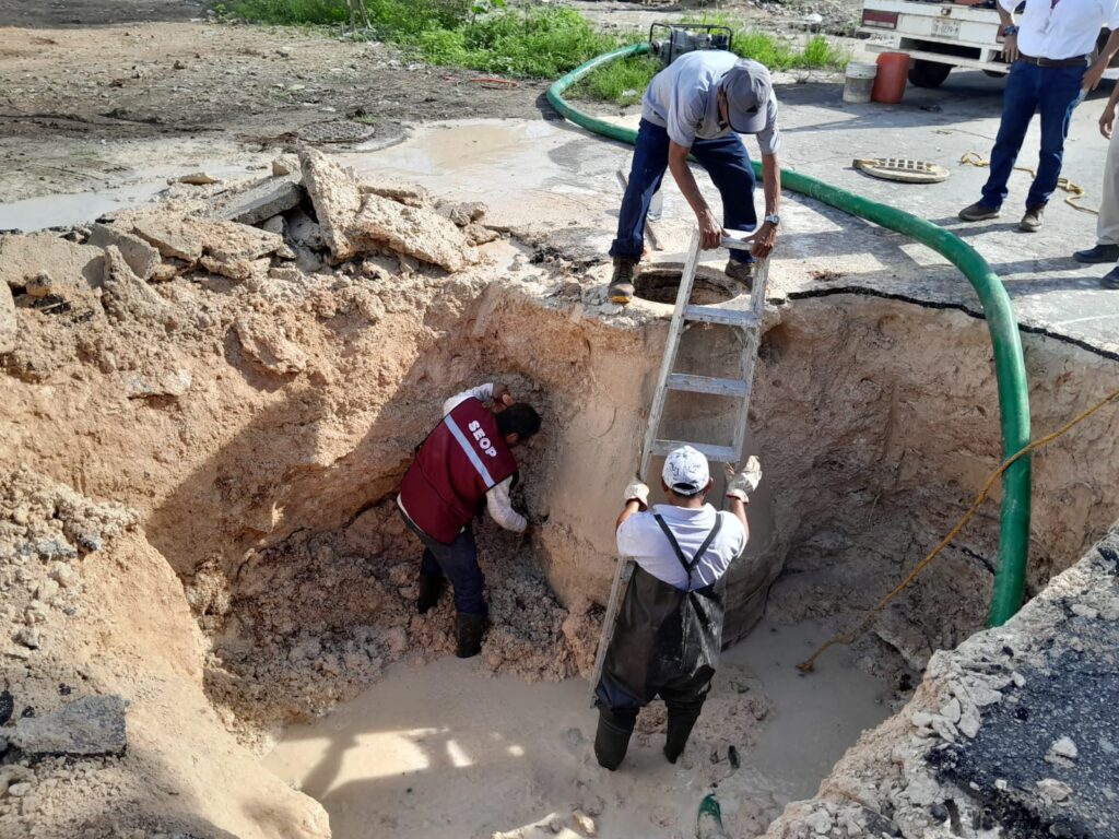 Por instrucciones de la gobernadora Mara Lezama Espinosa, personal de la Secretaría de Obras Públicas (SEOP), en coordinación con la Comisión de Agua Potable y Alcantarillado (CAPA), realizan trabajos de atención inmediata en el socavón que se registró en la avenida Maxuxac, entre Miguel Alemán y 4 de Marzo, en la capital del estado.