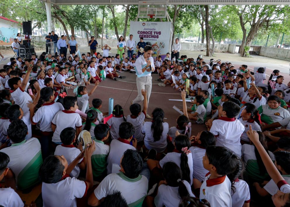 Cancún.- La Presidenta Municipal, Ana Paty Peralta, encabezó la jornada “Conoce tus Derechos”, impulsada mediante el Sistema Municipal de Protección Integral de Niñas, Niños y Adolescentes (SIPINNA) Benito Juárez, para más de 300 estudiantes de la escuela primaria urbana federal “Ek Balam”, a quienes enseñó a cuidar y defender sus derechos para vivir una vida libre de violencia.