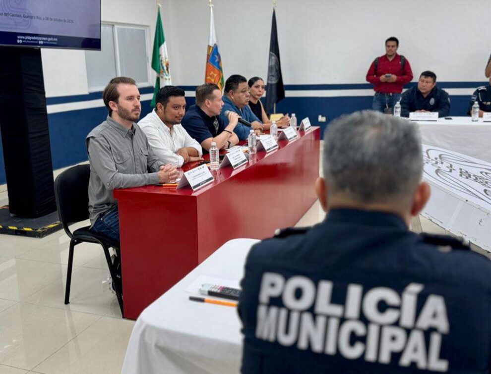 Playa del Carmen.- El regidor del Ayuntamiento y coordinador del Partido Verde en Playa del Carmen, Fernando Muñoz Calero, participó en una reunión de trabajo entre el Cabildo y la Secretaría de Seguridad Ciudadana Municipal, encabezada por el secretario General, Luis Armando Herrera Quiam, y el titular de seguridad en el municipio, Carlos Montesinos García, en la que se reconoció la trayectoria, entrega y compromiso de las y los policías que culminan su servicio tras 25 años de labor.