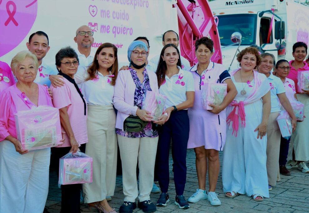 En el marco del mes de sensibilización sobre el cáncer de mama, la Presidenta Municipal, Ana Paty Peralta y la titular honoraria del Sistema para el Desarrollo Integral de la Familia (DIF) Quintana Roo, Verónica Lezama Espinosa, dieron el banderazo de salida de dos camiones recolectores rotulados en color rosa de la empresa Red Ambiental y encabezaron la entrega de 23 prótesis mamarias externas y brasieres ortopédicos a mujeres beneficiarias de diversas asociaciones civiles, como parte de la quinta edición de la campaña “Detectar es vivir: autoexplórate”.