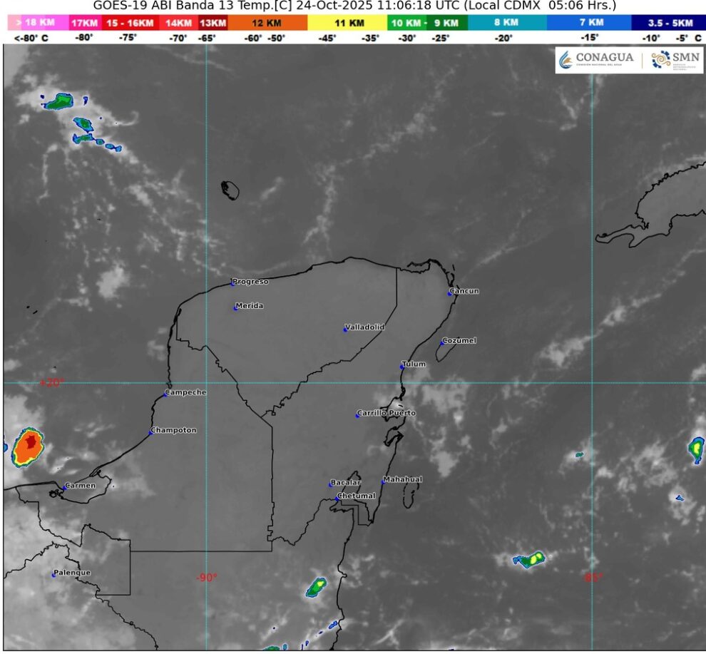 En la Península de Yucatán, durante la mañana habrá ambiente templado y durante la tarde será cálido en la región. Cielo medio nublado durante el día, con chubascos y descargas eléctricas en Campeche (oeste) y Quintana Roo (sur). Sin lluvia en Yucatán, con viento del noreste de 10 a 25 km/h con rachas de 35 a 50 km/h en costas de la península. Oleaje de 1.0 a 2.0 metros de altura en costas de Quintana Roo